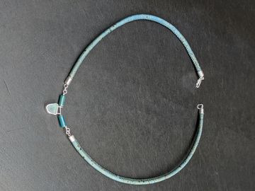 Aqua seaglass, in silver with turquoise beads, set on blue cork necklace.
