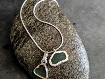 Dark green seaglass pendants set in fine silver on sterling silver snake chain.